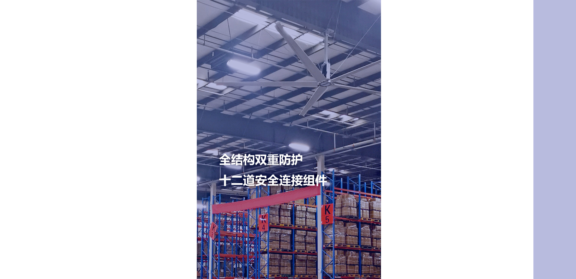 物流倉(cāng)庫(kù)使用大型工業(yè)吊扇,能促進(jìn)整個(gè)空間內(nèi)外空氣流通,解決悶熱,平衡空氣濕度,有效避免其它通風(fēng)方案的局限性(安全及能耗),改善工作環(huán)境。